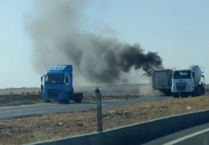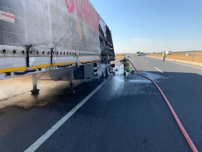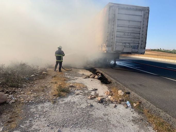 Kızıltepe yönünden Nusaybin istikametine giden Abdulaziz Danıst yönetimindeki 47 KS 159 içki yüklü TIR seyir halindeyken fren balataların ısınması nedeniyle dorsesi alev aldı. Sürücü Danıst, yandığını fark ettiği andan itibaren aracı sağa çekerek TIR´ın ön kısmını dorsesinden ayırarak yanmaktan kurtardı.