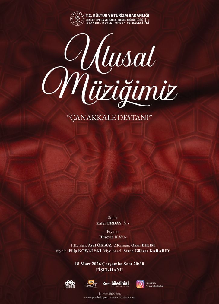 Çanakkale Destanı'nı çok sesli müziğin güçlü anlatımıyla sahneye taşıyan İstanbul Devlet Opera ve Balesi'nin (İDOB) "Ulusal Müziğimiz: Çanakkale Destanı" konseri 18 Mart'ta Fişekhane'de sanatseverlerle buluşacak