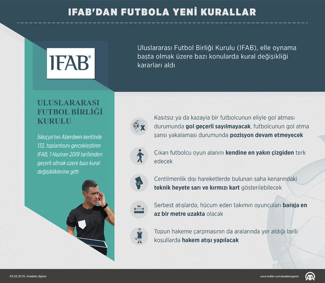 Uluslararası Futbol Birliği Kurulu (IFAB), 1 Haziran 2019 tarihinden itibaren geçerli olacak değişen futbol kuralları ile ilgili açıklama yayınladı. 8 kuralda değişikliğe gidildiğini duyuran kurulun aldığı kararlar şöyle: