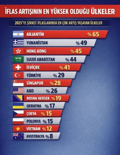 Küresel ölçekte iflasların arttığı ülkeler arasında Arjantin yüzde 65, Yunanistan yüzde 49 ve Hong Kong yüzde 45 ile öne çıkarken, ABD’de artış yüzde 26 seviyesinde gerçekleşti. Türkiye yüzde 29’a yakın artışla üst sıralarda yer aldı.