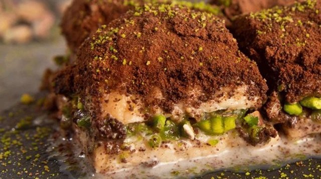 Daha sonra kakao ve süt tozu karıştırılarak bir süzgeç yardımıyla baklavanın her yerine gezdirilir. Buzdolabına beklemeye alınır. Bekleme işlemi tamamlandıktan sonra üzeri toz fıstık ve çikolata rendesi ile süslenerek servis edilir. Soğuk baklava hazır. Afiyet olsun.