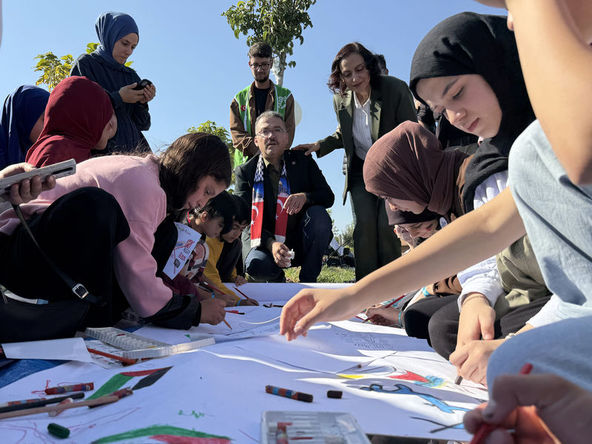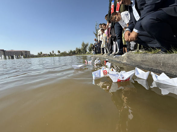 Iğdır Millet Bahçesi'nde, 45'ten fazla ülkeden yüzlerce aktivistin yer aldığı Küresel Sumud Filosu'na destek için düzenlenen etkinlikte çocuklar yaptıkları kâğıt gemileri gölete bıraktı; Filistin ve Gazze temalı çalışmaların yer aldığı programa Vali Ercan Turan da katıldı