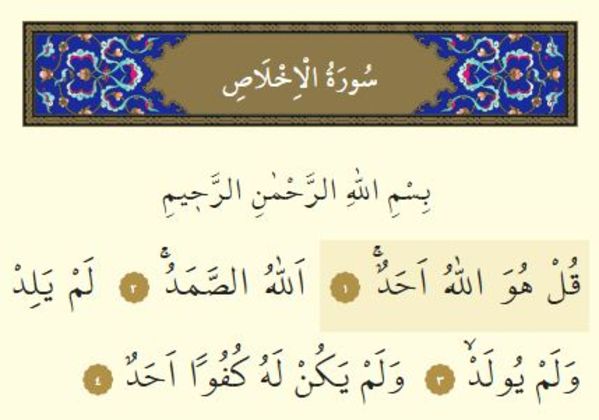 Kul hüvellâhü ehad Allâhüssamed Lem yelid ve lem yûled Ve lem yekün lehû küfüven ehad
