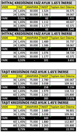 100 bin liralık bir otomobil için kullanılacak 75 bin liralık kredinin faizindeki yarım puanlık indirim, vatandaşın 36 ay vade için 9 bin, 60 ay vade için ise 15 bin lira az faiz ödemesi anlamına geliyor. Taşı kredisindeki faiz indirimi aylık 75 baz puan olduğu takdirde ise vatandaşın toplam geri ödemesi 3 yıl vade için 12 bn 500 lira, 5 yıl vade için de 23 bin lira azalıyor.