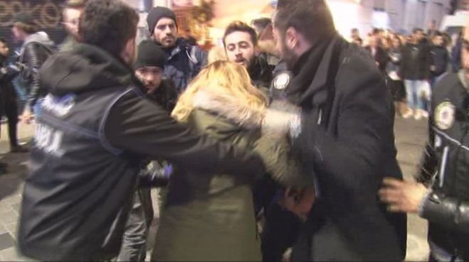 Yılbaşında eğlenmek için İstanbul Beyoğlu ilçesinde İstiklal Caddesi'ne gelen iki grup eğlencenin dozunu kaçırınca birbirine girdi. Tekme ve yumrukların havada uçuştuğu kavgada bir kız, karşı taraftan bir erkeğin saçını çekerek uzun süre bırakmadı. Polis tarafları ayırmakta güçlük çekti