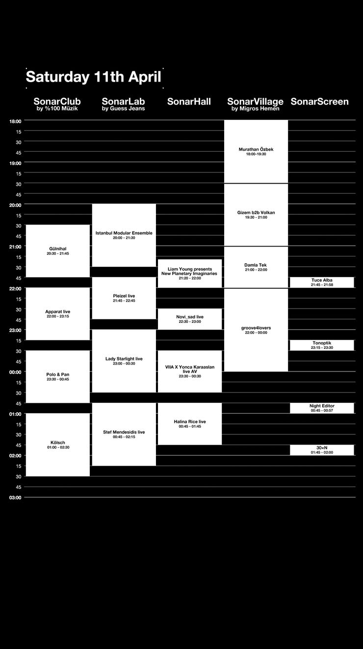 Festivalin ikinci günü, tekno müziğe melodiyle ritimleri getiren Kölsch sahnedeki performansıyla damga vuracak. Duygusal derinliğiyle Apparat ile neşeli dünya ritimleriyle Polo & Pan eşlik edecek. Novi_sad ve Stef Mendesidis'in ileri teknik performansları da ikinci günün merakla beklenen anları arasında. Lady Starlight ise analog makineler ve ham techno enerjisiyle dans pistini yüksek voltajlı bir canlı performansla selamlayacak. Yerel sahnenin en güçlü temsilcilerinin ikinci günde de boy göstereceği festivalde, Damla Tek, Gülnihal, Gizem b2b Volkan ve groove4lovers, house ve techno arasında mekik dokuyan setleriyle kulüp atmosferini zirveye taşıyacak. Murathan Özbek & Serdar Ormancı nostaljik tınıları çağdaş elektronik enerjiyle buluştururken, Pleizel atmosfer, doku ve titizlikle inşa edilmiş bir enerji etrafında şekillenen canlı performansını sahneye taşıyacak. Görsel-işitsel alanda ise 30×N, hesaplama, ses ve ışığın eş zamanlı filizlendiği dinamik bir deneyimle algoritmalar ve izleyici arasındaki anlık etkileşimi sorgularken, Halina Rice elektronik ses ve görselliğin iç içe geçtiği immersif bir performans sunacak. Liam Young, New Planetary Imaginaries başlıklı görsel sunumuyla gezegen ölçeğindeki teknolojileri mercek altına alırken, Night Editor teknoloji, ses ve algının iç içe geçtiği bir görsel-işitsel yolculuğa çıkarıyor. Tonoptik teknolojik süreçleri sürükleyici deneyimlere dönüştürürken, Tuce Alba mimari düşünce, gelenek ve deneysel ses üretimini buluşturan performansıyla izleyicileri bekliyor. VIIA x Yonca Karaarslan live AV ve Istanbul Modular Ensemble da ikinci günün görsel-işitsel zenginliğini tamamlıyor.