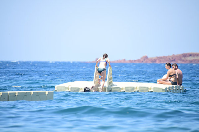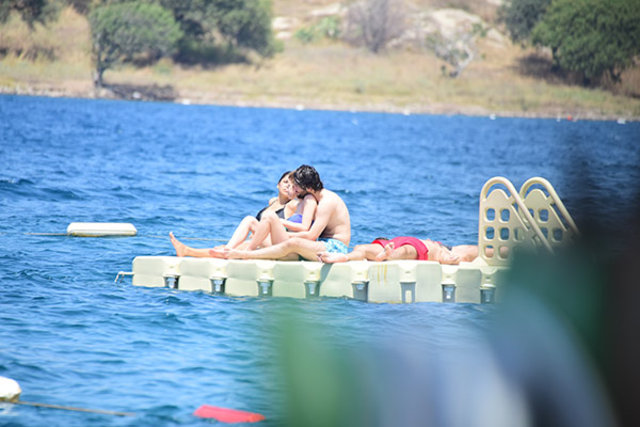 Sıcaktan bunalan sevgililer, iskeleden denize gireceği sırada birbirlerine sarıldı. Denizde yaklaşık yarım saat kalan ikili, çıktıktan sonra voleybol oynayarak günü bitirdi.