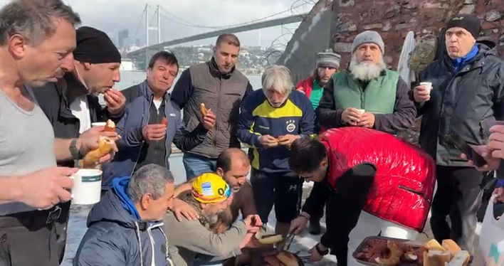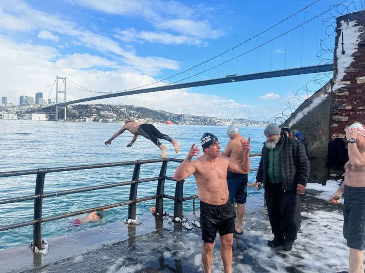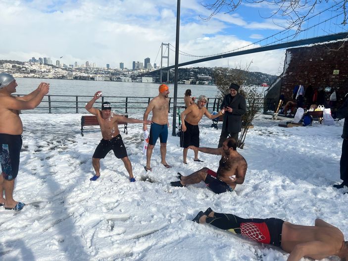 Ardından Boğaz'ın buz gibi sularına atladı. Dakikalarca suda kalan grup daha sonra yaktıkları ateşte ısınarak sucuk pişirdi.