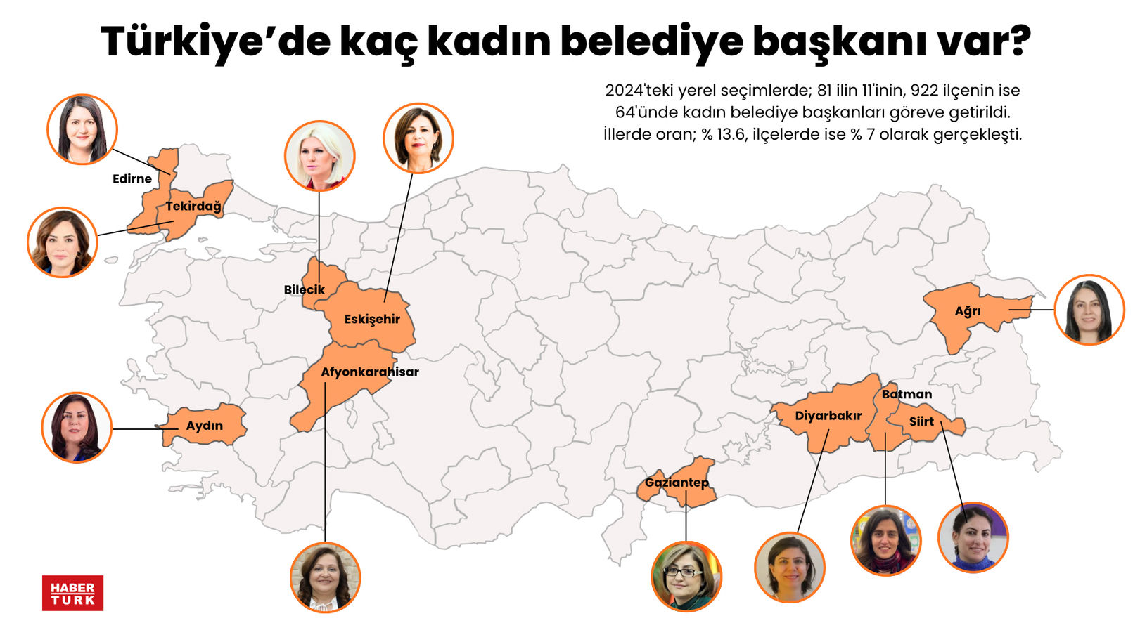 2024'teki yerel seçimlerde; 81 ilin 11'inin, 922 ilçenin ise 64'ünde kadın belediye başkanları göreve getirildi. İllerde kadın belediye başkanı oranı; % 13.6, ilçelerde ise % 7...