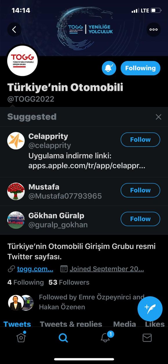 Türkiye’nin Otomobili @togg2022 adlı hesabın ilk takip ettiği hesaplar Anadolu Grubu, BMC, Kıraça Holding, Turkcell ve Zorlu Holding’den oluşan 5 ‘babayiğit’in resmi twitter hesapları oldu. Ardından TOGG'da yüzde 5 hissesi bulunan Türkiye Odalar ve Borsalar Birliği'nin (TOBB) resmi twitter hesabı takibe alındı. TOBB Başkanı ve Eurochambres Başkan Yardımcısı Rifat Hisarcıklıoğlu ile TOGG CEO'su Mehmet Gürcan Karakaş'ın kişisel hesapları da takibe alındı.