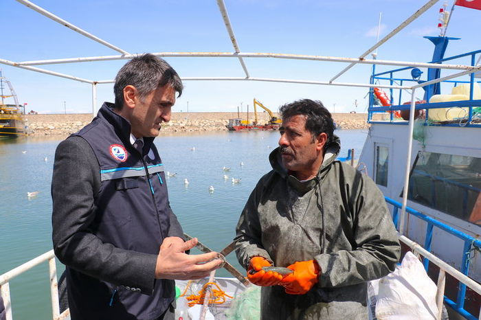 Van İl Tarım ve Orman Müdürü Turgay Şişman da Edremit ilçesindeki iskeleye çekilen balıkçı teknelerinde incelemelerde bulundu, beraberindeki Su Ürünleri Şube Müdürü Muhammet Demir'den bilgi aldı.