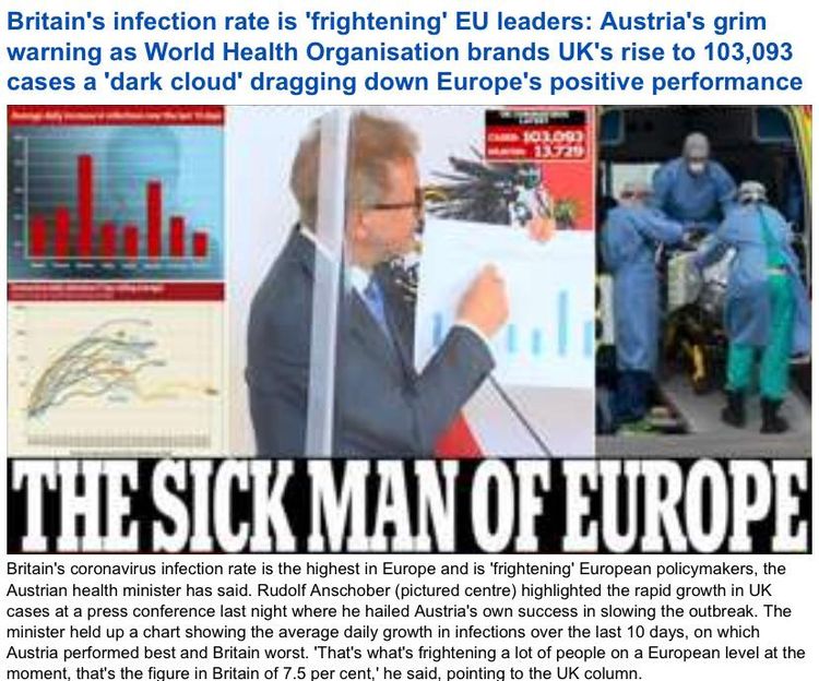 İngiltere'nin çok satan tabloid gazetelerinden Daily Mail'in internet sitesinin manşetinde İngiltere'deki koronavirüs vakalarının yoğunluğu nedeniyle 'Avrupa'nın hasta adamı' benzetmesi yapıldı. Benzetme ilk olarak son dönemlerindeki Osmanlı İmparatorluğu'nu tanımlamak için dönemin Rus Çarı Nikolas tarafından yapılmış ardından tarih literatüründe kendine yer bulmuştu.