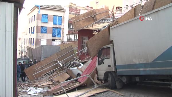 İstanbul Fatih’te yıkımı devam eden 4 katlı binanın inşaat iskelesi çöktü. İskele, tek katlı evin ve park halindeki 2 aracın üzerine devrildi.