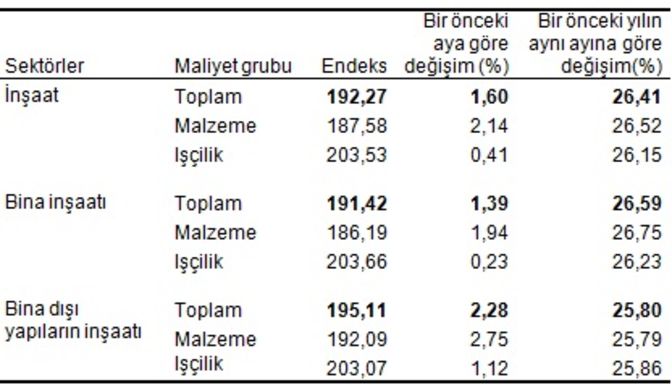 Bina inşaatı maliyet endeksi, bir önceki aya göre %1,39, bir önceki yılın aynı ayına göre %26,59 arttı. Bir önceki aya göre malzeme endeksi %1,94, işçilik endeksi %0,23 arttı. Ayrıca bir önceki yılın aynı ayına göre malzeme endeksi %26,75, işçilik endeksi %26,23 arttı.