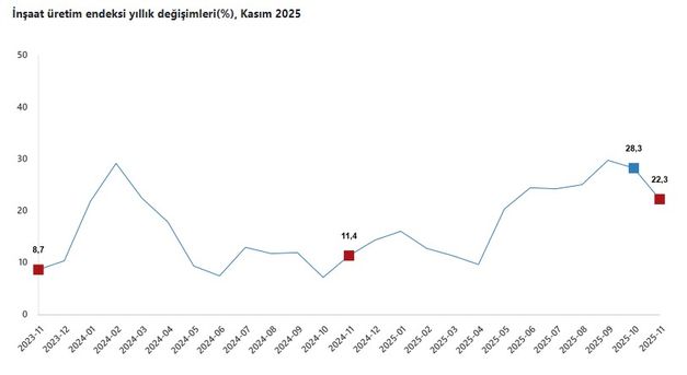 İnşaatın alt sektörleri incelendiğinde endeksin, Kasım 2025'te Kasım 2024'e kıyasla bina inşaatı sektöründe yüzde 23,4, bina dışı yapıların inşaatında yüzde 16,7 ve özel inşaat faaliyetlerinde yüzde 22,5 yükseldiği görüldü.