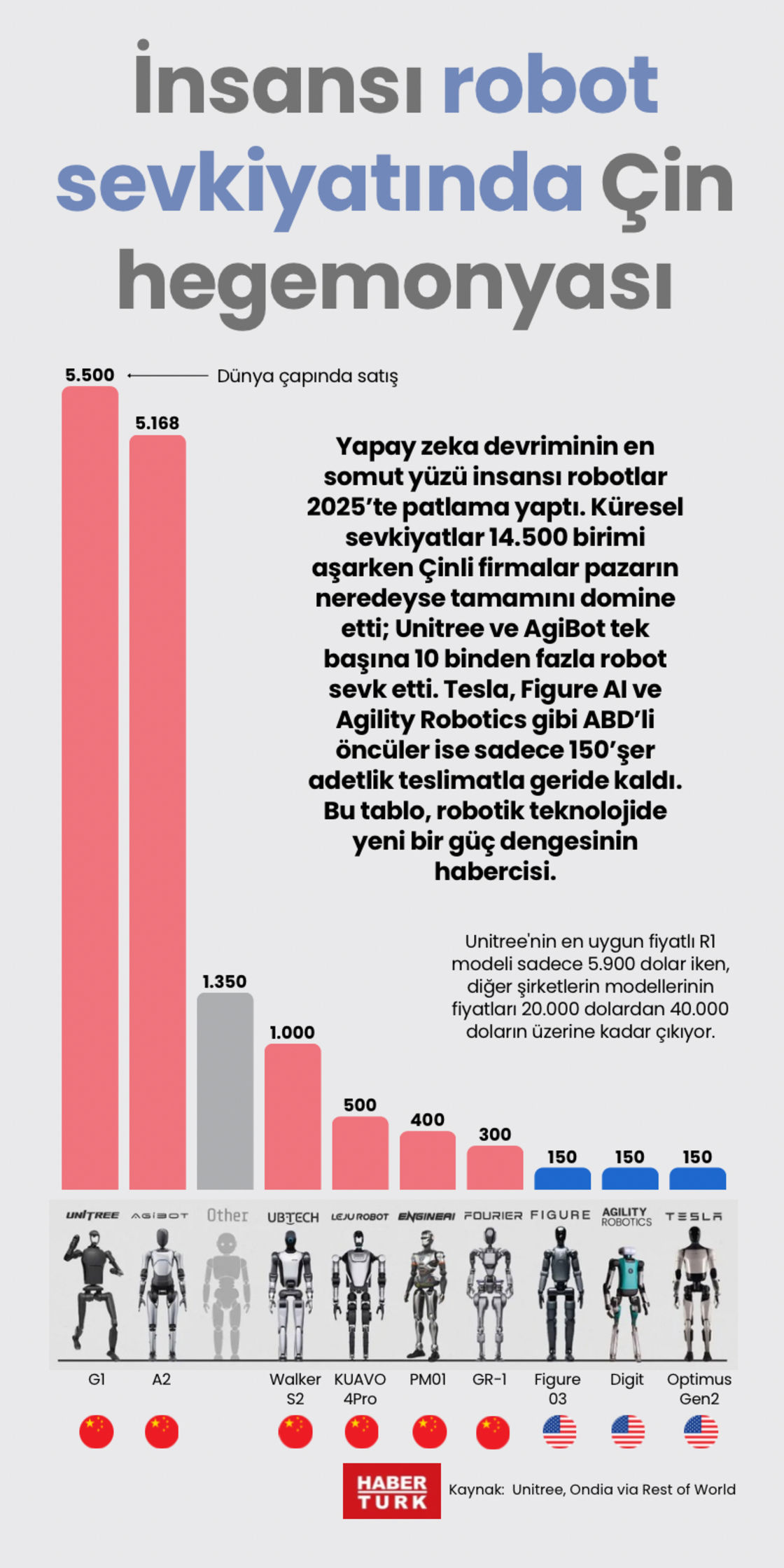 Yapay zeka devriminin en somut yüzü insansı robotlar 2025'te patlama yaptı. Küresel sevkiyatlar 14.500 birimi aşarken Çinli firmalar pazarın neredeyse tamamını domine etti; Unitree ve AgiBot tek başına 10 binden fazla robot sevk etti. Tesla, Figure AI ve Agility Robotics gibi ABD'li öncüler ise sadece 150'şer adetlik teslimatla geride kaldı. Bu tablo, robotik teknolojide yeni bir güç dengesinin habercisi.