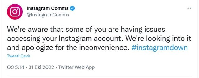 "Bazılarınızın Instagram hesabınıza erişim sorunları yaşadığının farkındayız. İnceliyoruz ve verdiğimiz rahatsızlıktan dolayı özür dileriz."