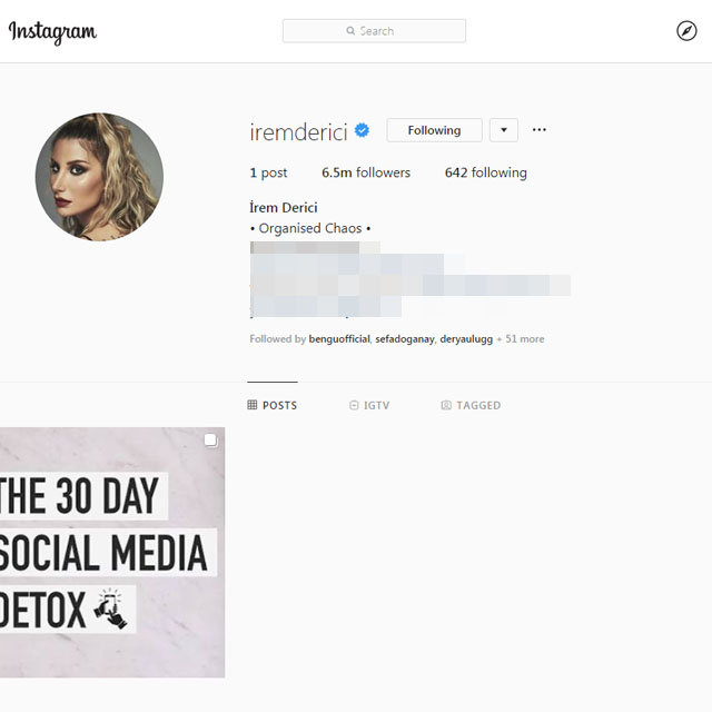Ünlü şarkıcı İrem Derici, Instagram paylaşımlarını sildi