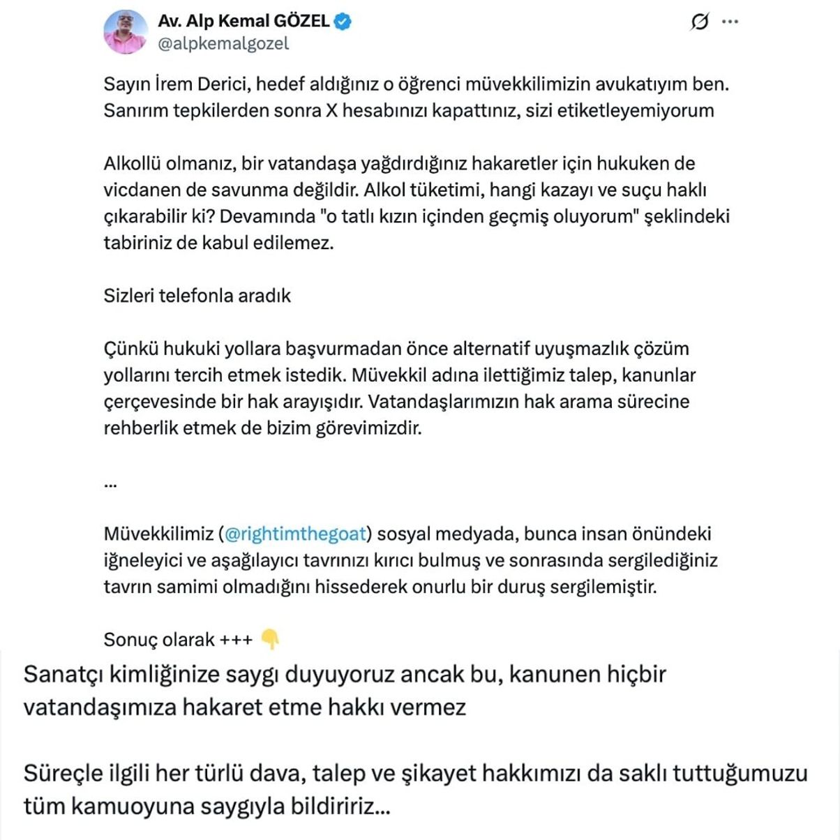 Attığı tweet'i yanlış anlayan ve oldukça sert çıkışan İrem Derici'ye avukat Alp Kemal Gözel tepki gösterdi
