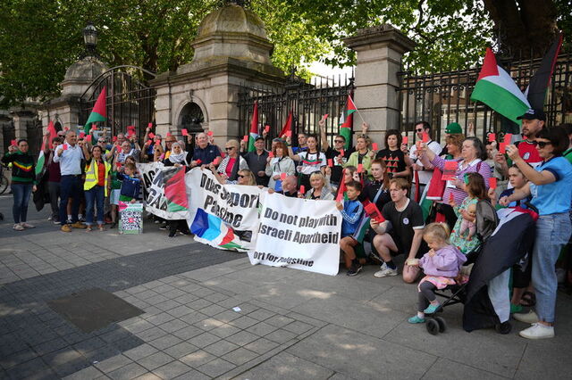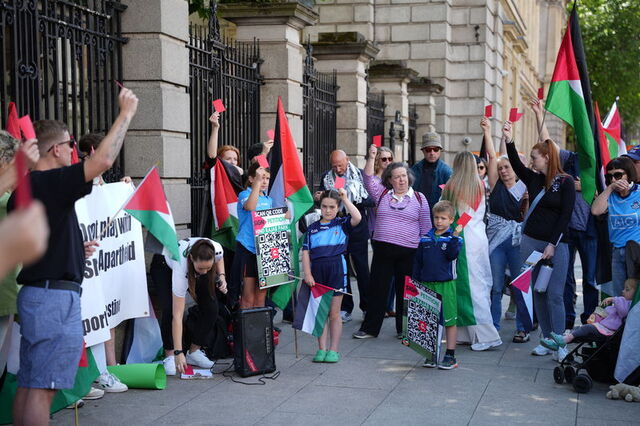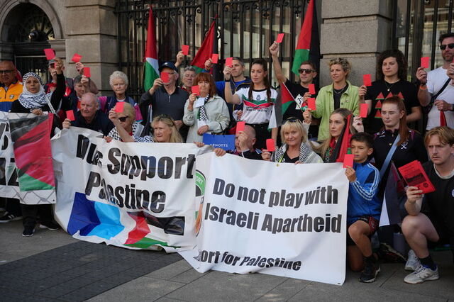 İrlanda'nın başkenti Dublin'de sporcular, Filistin'e destek gösterisi yaptı. Göstericiler, İsrail'in uluslararası alanda spor etkinliklerine katılmaması gerektiğini belirtmek için temsili "kırmızı kart" gösterdi. Dublin'de sağlık çalışanları da ABD'nin Dublin Büyükelçiliği önünde Filistin için toplandı