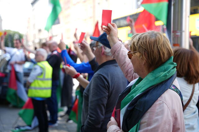 Göstericiler, İsrail'in uluslararası alanda spor etkinliklerine katılmaması gerektiğini belirtmek için temsili "kırmızı kart" gösterdi.