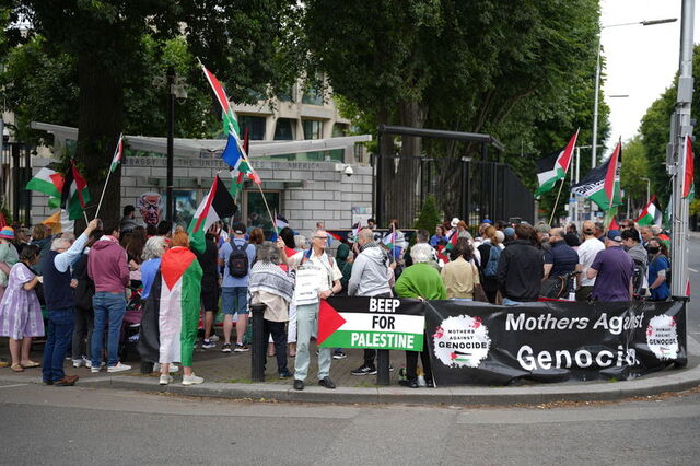 Göstericiler, "Siyonizmin zincirlerini kırın", "Soykırımı sonlandırın" ve "Filistinli bebekler hedef değil" yazılı dövizler açtı.