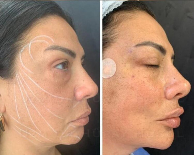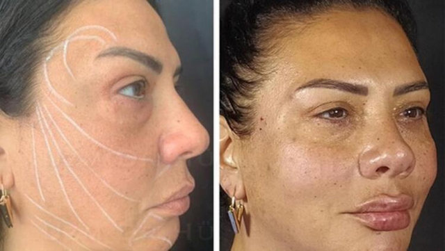 Karaca, ameliyat öncesi ve sonrası görüntülerini paylaştı. "Fransız askısının yeni sürümü" diyen Karaca'nın elmacık kemikleri dolgunlaşıp havaya kalktı, dudaklar büyüdü, çenesi de biraz sivrildi.