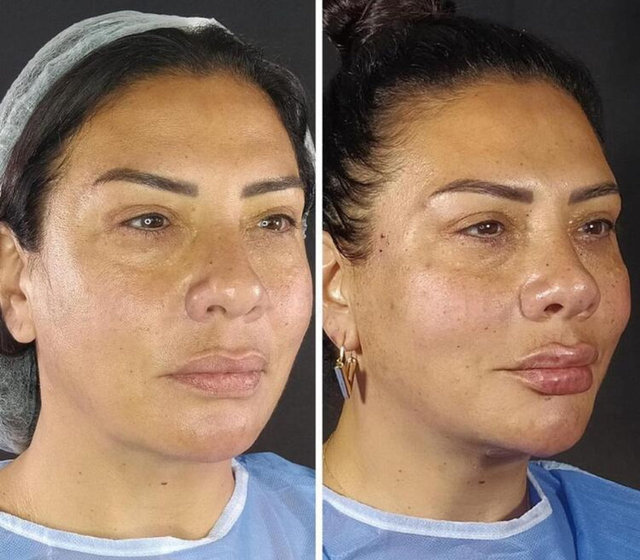 Karaca, ameliyat öncesi ve sonrası görüntülerini paylaştı. "Fransız askısının yeni sürümü" diyen Karaca'nın elmacık kemikleri dolgunlaşıp havaya kalktı, dudaklar büyüdü, çenesi de biraz sivrildi.