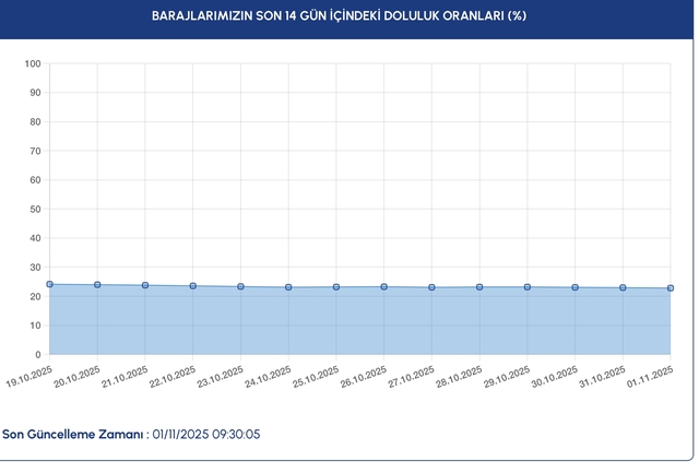 İSKİ'nin resmi ineternet sitesinden alınan bilgiye göre, İstanbul'da barajların genel doluluk oranı 1 Kasım Cumartesi günü yüzde 22,81 olarak ölçüldü.