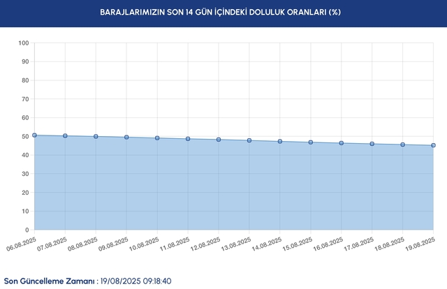 İSKİ 19 Ağustos baraj doluluk oranını duyurdu. İstanbul Su ve Kanalizasyon İdaresi barajlardaki su seviyesini grafiklerle açıklıyor. Yaz aylarında düşüşe geçen barajlardaki su seviyesi merak ediliyor. İstanbul barajlarının genel doluluk oranı 5 Ağustos'ta 51,04 seviyesindeyken 19 Ağustos itibariyle bu oran 45,21'ye geriledi.