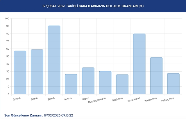 İSKİ’nin 19 Şubat 2026 tarihli verilerine göre İstanbul’daki barajların ortalama doluluk oranı yüzde 41,58 olarak kaydedildi