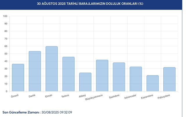 İstanbul baraj doluluk oranı güncel olarak İSKİ tarafından duyuruluyor. Yaz mevsiminin gelmesi yağışların azalmasıyla birlikte baraj doluluk oranında düşüş gözlemlendi. Peki 30 Ağustos 2025 İstanbul'da baraj doluluk oranı yüzde kaç? İşte, İstanbul'un en önemli su kaynaklarının güncel doluluk oranları