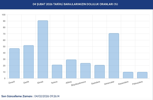 İstanbul baraj doluluk oranı İSKİ tarafından açıklandı. 3 Şubat 2026 tarihi itibarıyla İSKİ (İstanbul Su ve Kanalizasyon İdaresi) tarafından açıklanan en güncel verilere göre, İstanbul barajlarının ortalama doluluk oranı %32,3 seviyesine ulaştı. Peki, 4 Şubat bugün İstanbul'da baraj doluluk oranı yüzde kaç oldu?