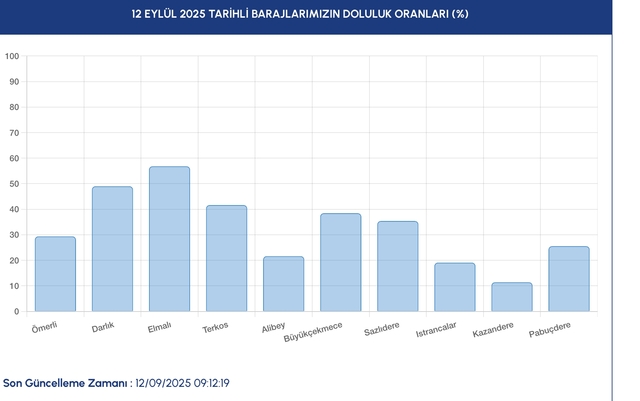 İstanbul'a su sağlayan barajlardaki doluluk oranlarında düşüş sürüyor. Yağışların yetersiz olmasıyla birlikte barajlardaki su seviyeleri gerilemeye başladı. Peki, 12 Eylül İstanbul baraj doluluk oranı yüzde kaç oldu?