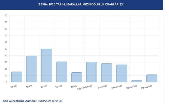 İstanbul baraj doluluk oranı açıklandı. İstanbul Su ve Kanalizasyon İdaresi (İSKİ), Ömerli, Elmalı, Terkos, Alibeyköy, Sazlıdere, Büyükçekmece, Istrancalar ve diğer barajlara ait doluluk oranlarını günlük olarak güncelliyor. Peki, 13 Ekim İstanbul'da baraj doluluk oranı yüzde kaç oldu?