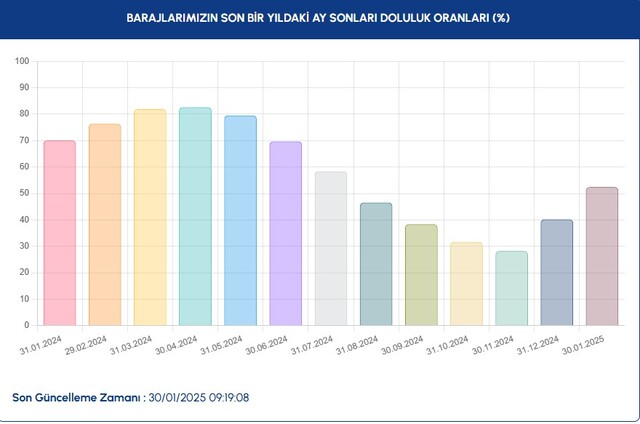 İstanbul Su ve Kanalizasyon İdaresi (İSKİ) verilerine göre baraj doluluk oranı güncel olarak duyuruluyor. Ömerli, Darlık, Elmalı, Terkos, Alibey, Büyükçekmece, Sazlıdere, Istrancalar, Kazandere, Pabuçdere barajlarındaki son durum merak ediliyor. Peki, 30 Ocak İstanbul Baraj doluluk oranı yüzde kaç oldu?