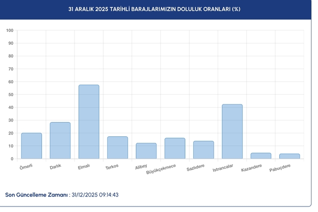 İSKİ tarafından İstanbul baraj doluluk oranı açıklandı. İstanbul'un içme suyu ihtiyacını karşılayan barajlarda son durum yakından takip ediliyor. Son günlerde etkili olan yağışların ardından İSKİ tarafından paylaşılan 31 Aralık tarihli baraj doluluk oranları merak edildi. Peki, 31 Aralık 2025 İstanbul baraj doluluk oranı yüzde kaç oldu, son durum ne?