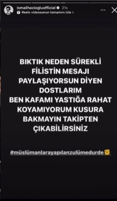 İsmail Hacıoğlu, paylaşımlarından rahatsız olan bazı takipçilerine şöyle tepki gösterdi: "Bıktık, neden sürekli Filistin mesajı paylaşıyorsun?" diyen dostlarım! Ben, kafamı yastığa rahat koyamıyorum. Kusura bakmayın, takipten çıkabilirsiniz.