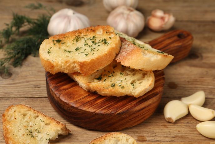- Bayat ekmek dilimlerinin üzerine sarımsaklı tereyağı sürün.