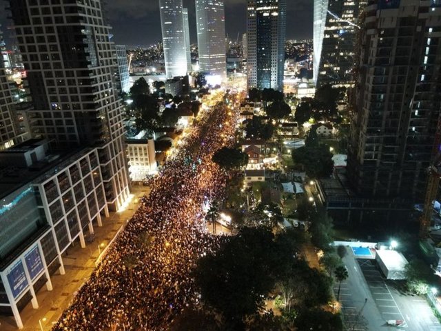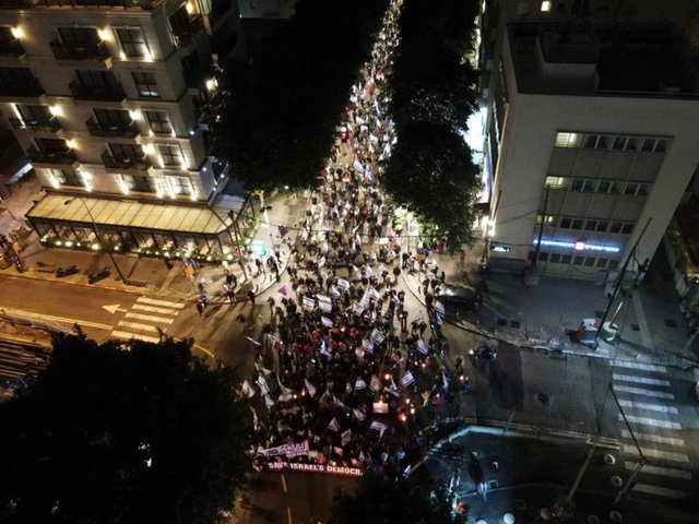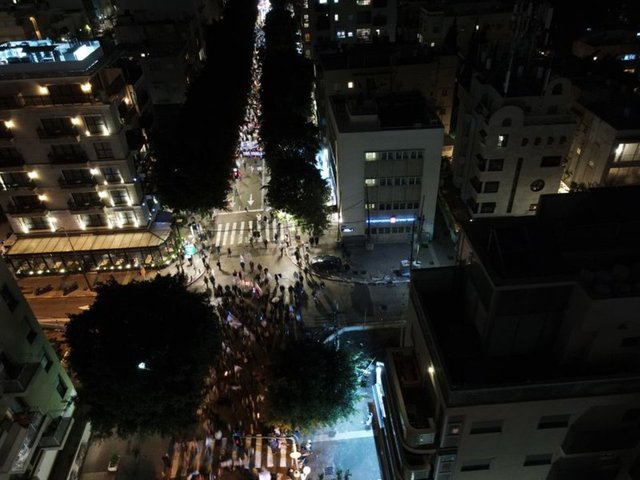 Tel Aviv kent merkezindeki Eliezer Kaplan Caddesinde toplanan her yaştan binlerce gösterici İsrail bayrakları taşıdı. Göstericiler, "diktatörlüğe hayır" ve "demokrasi" sloganları attı. Kurulan sahnelerde eski siyasetçiler, sanatçılar ve önde gelen isimler söz aldı. İsrail basınına göre, Tel Aviv'deki gösterilere yaklaşık 50 bin kişi katıldı.