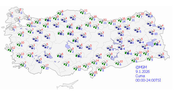 Yüksek kesimlerde bu miktarların birkaç katı kadar yağacaktır. 10 Ocak Cumartesi bu hızlı ama kuvvetli yağışlar kesilecek görünüyor. Bu süreçte batı bölgelerin neredeyse tamamı kuvvetli yağmur, batının yüksekleri zayıf kar ve Anadolu yükseklerinde orta kuvvette, merkezlerde zayıf kar şeklinde, Türkiye haritasına yayılan yağışlar olacak.