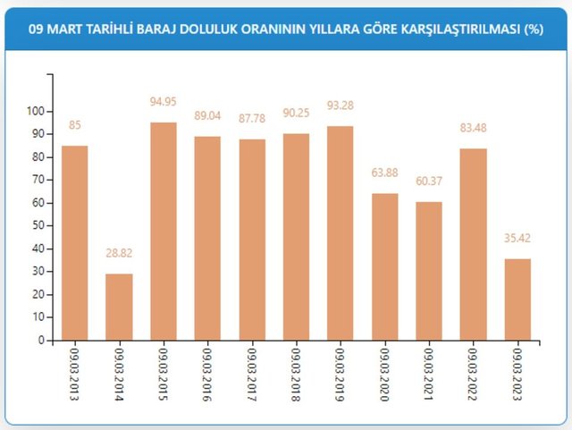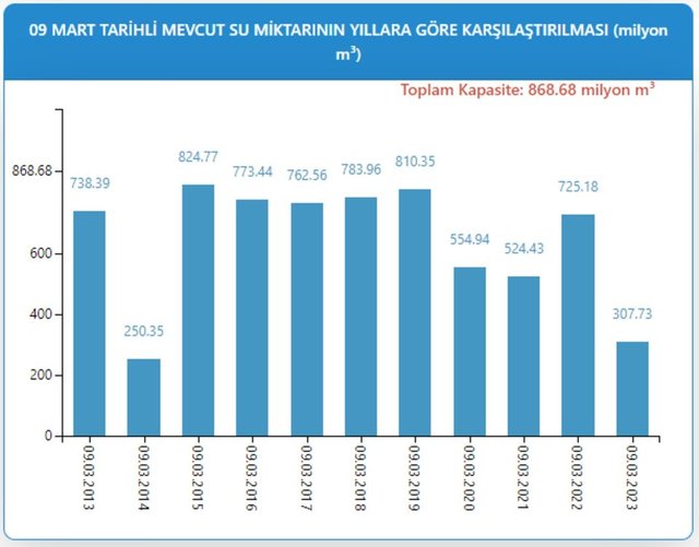 İSKİ istatistiklerine göre 9 Mart tarihli baraj doluluk oranları 2013'te yüzde 85, 2014'te yüzde 28,82, 2015'te yüzde 94,95, 2016'da yüzde 89,04, 2017'de yüzde 87,78, 2018'de yüzde 90,25, 2019'da yüzde 93,28, 2020'de yüzde 63,88, 2021'de yüzde 60,37, 2022'de ise yüzde 83,48 olarak kaydedildi.
