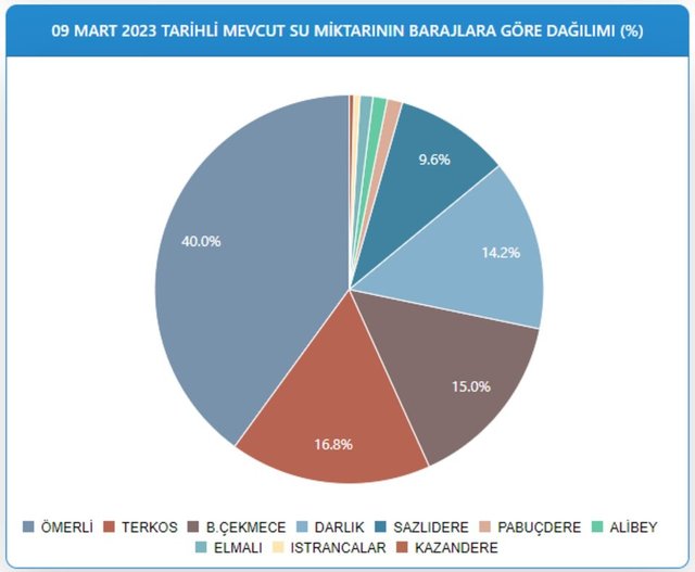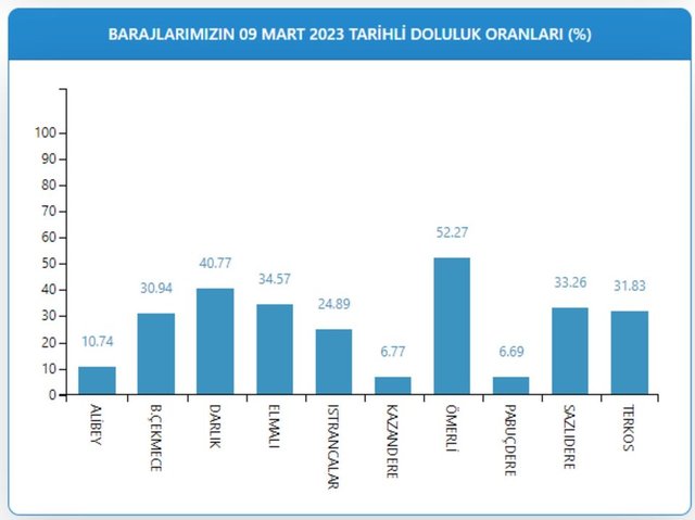 Barajların doluluk oranları Alibey'de yüzde 10,74, Büyükçekmece'de yüzde 30,94, Darlık'ta yüzde 40,77, Elmalı'da yüzde 34,57, Istrancalar'da yüzde 24,89, Kazandere'de yüzde 6,77, Ömerli'de yüzde 52,27, Pabuçdere'de yüzde 6,69, Sazlıdere'de yüzde 33,26, Terkos'ta ise yüzde 31,83 olarak kaydedildi.