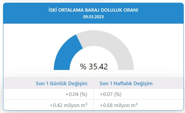 İstanbul Büyükşehir Belediyesi (İBB) Su ve Kanalizasyon İdaresi (İSKİ) verilerine göre barajların su seviyesi, yüzde 35,42 olarak ölçüldü.