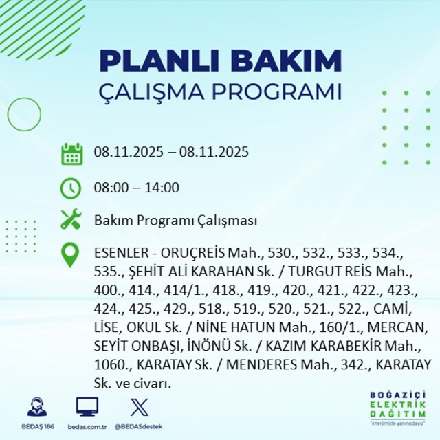 İstanbul Avrupa yakasında planlı elektrik kesintisi yaşanacak ilçelerin ve mahallelerin yer aldığı Planlı Elektrik Kesinti listesine, www.bedas.com.tr web sitesinde ana sayfada Planlı Kesintiler butonundan, mobil web sitesinden ve BEDAŞ 186 mobil uygulamasından ulaşabilirsiniz. Ayrıca Planlı Elektrik Kesintileri hakkında SMS bilgilendirilmesi almak için de BEDAŞ'a başvurabilirsiniz.