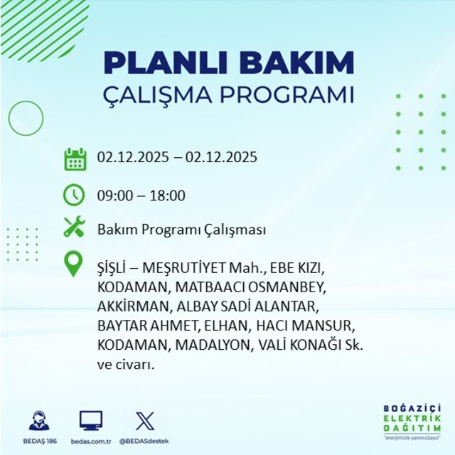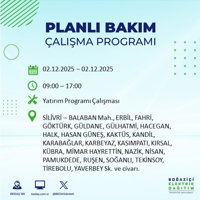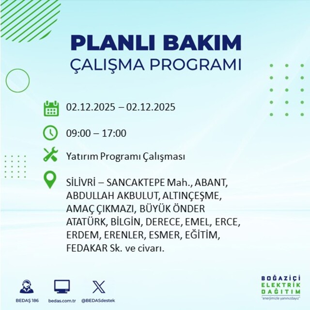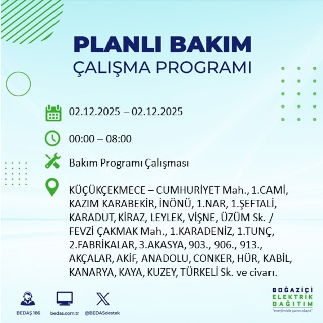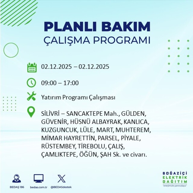İstanbul Avrupa yakasında planlı elektrik kesintisi yaşanacak ilçelerin ve mahallelerin yer aldığı Planlı Elektrik Kesinti listesine, www.bedas.com.tr web sitesinde ana sayfada Planlı Kesintiler butonundan, mobil web sitesinden ve BEDAŞ 186 mobil uygulamasından ulaşabilirsiniz. Ayrıca Planlı Elektrik Kesintileri hakkında SMS bilgilendirilmesi almak için de BEDAŞ'a başvurabilirsiniz.