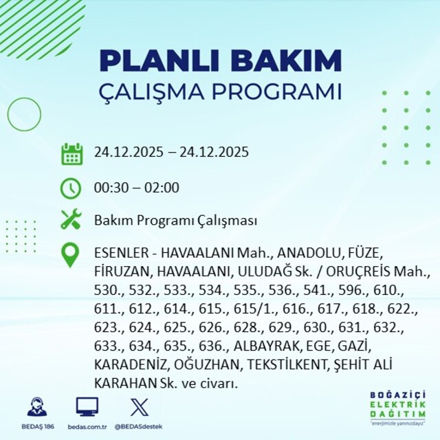 BEDAŞ tarafından yapılan açıklama kapsamında, 23 Aralık Çarşamba günü İstanbul'da farklı ilçelerde elektrik kesintisi yaşanacak yerler ve elektriklerin geleceği saatler açıklandı. Peki, 24 Aralık Çarşamba İstanbul'da elektrik kesintisi saat kaçta başlayacak ve elektrikler ne zaman gelecek? İşte İstanbul elektrik kesintisi duyuruları...