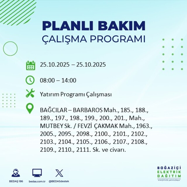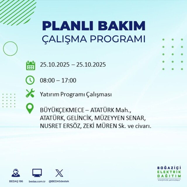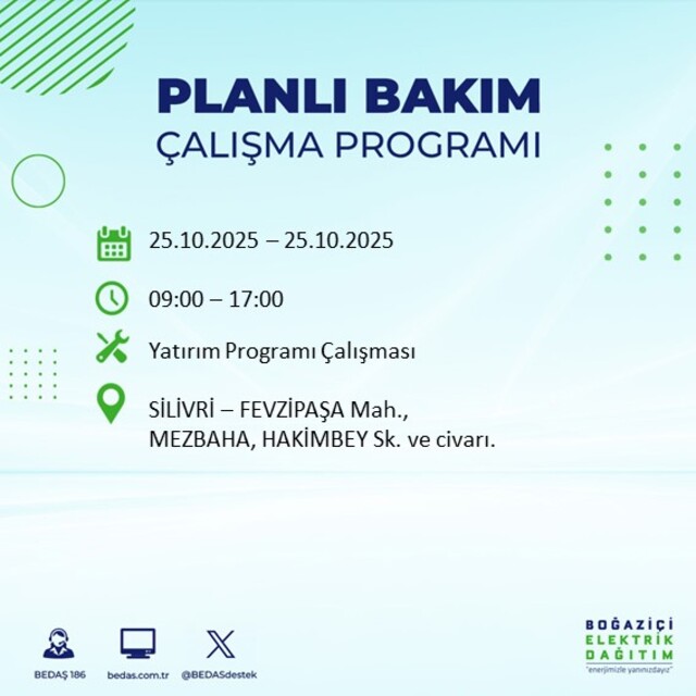 İstanbul Avrupa yakasında planlı elektrik kesintisi yaşanacak ilçelerin ve mahallelerin yer aldığı Planlı Elektrik Kesinti listesine, www.bedas.com.tr web sitesinde ana sayfada Planlı Kesintiler butonundan, mobil web sitesinden ve BEDAŞ 186 mobil uygulamasından ulaşabilirsiniz. Ayrıca Planlı Elektrik Kesintileri hakkında SMS bilgilendirilmesi almak için de BEDAŞ'a başvurabilirsiniz.