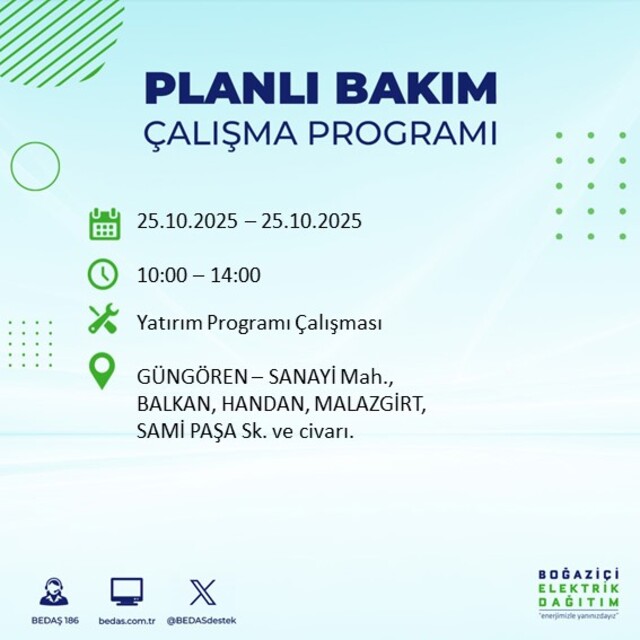 Boğaziçi Elektrik Dağıtım A.Ş. (BEDAŞ), İstanbul genelinde 25 Ekim Cumartesi günü planlı elektrik kesintisi uygulanacağını duyurdu. Yapılan açıklamanın ardından, "İstanbul'da elektrikler ne zaman gelecek, elektrikler saat kaçta kesilecek?" sorularını beraberinde getirdi. İşte detaylar...