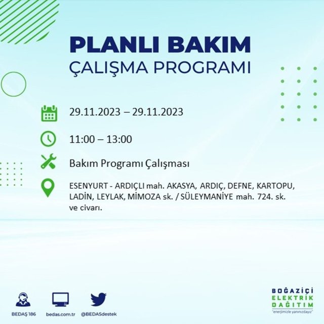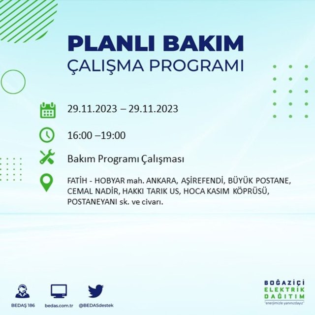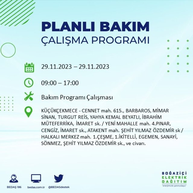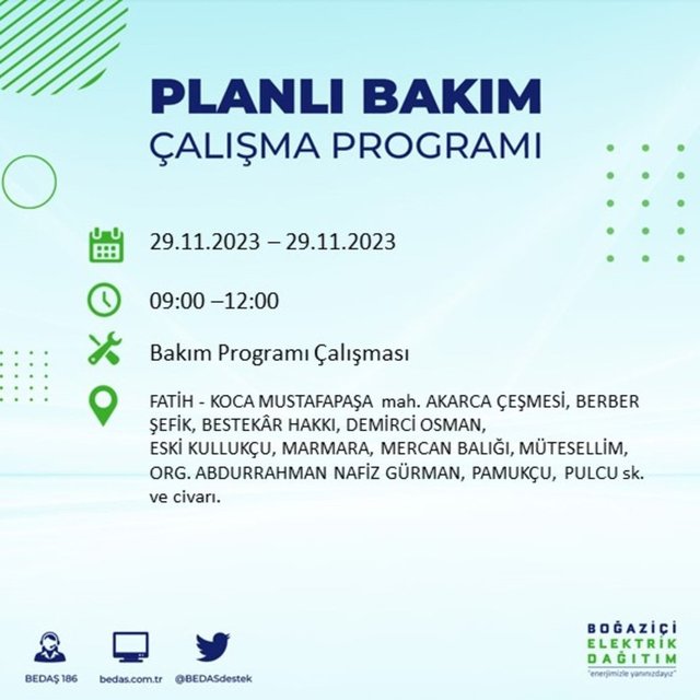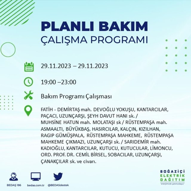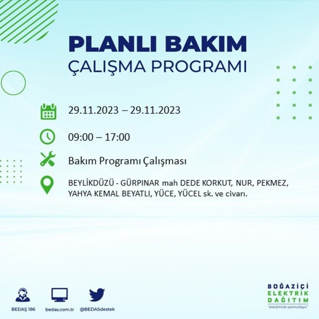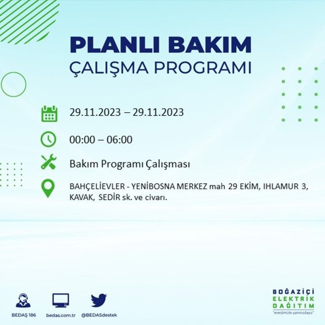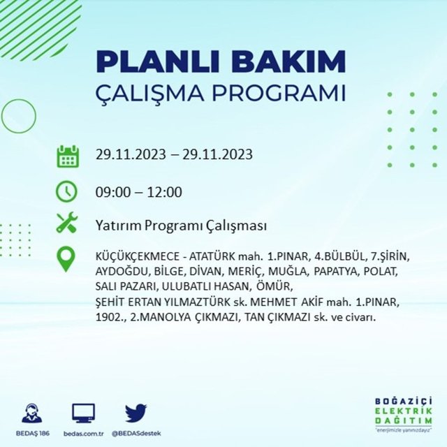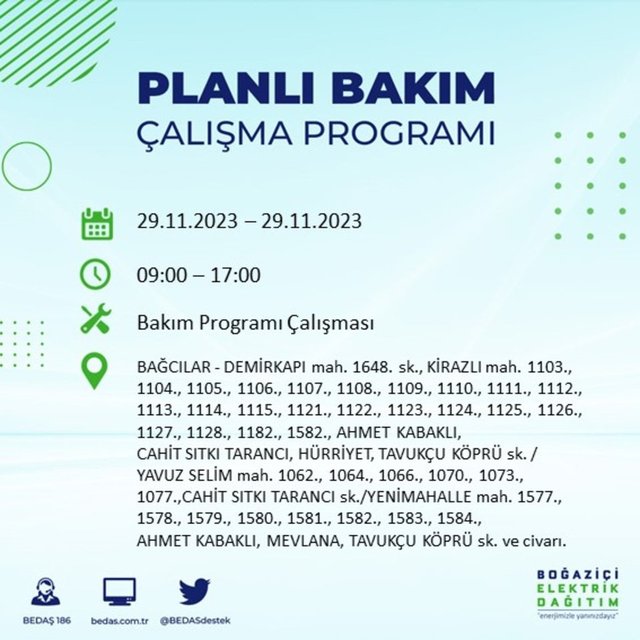İstanbul elektrik dağıtım tedarikçi firmalarından BEDAŞ elektrik arıza duyurularını günlük olarak paylaşıyor. BEDAŞ tarafından yapılan açıklamaya göre 29 Kasım Çarşamba günü İstanbul'da 19 ilçede elektrik kesintisi yaşanacak yerler ve elektriklerin geleceği saatler açıklandı.